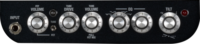 Tilt es un control SEE SAW EQ dinámico y potente. Este control tiene una posición neutral central. Girar el control en el sentido de las agujas del reloj aumenta las frecuencias medias a altas en general y disminuye las frecuencias bajas, lo que le da más presencia a su sonido, lo que puede ser útil para atravesar situaciones de bandas en vivo. Al girar el control en el sentido contrario a las agujas del reloj, se reducen las frecuencias medias a altas en general y se aumentan las frecuencias bajas, lo que hace que el sonido general sea más redondo.